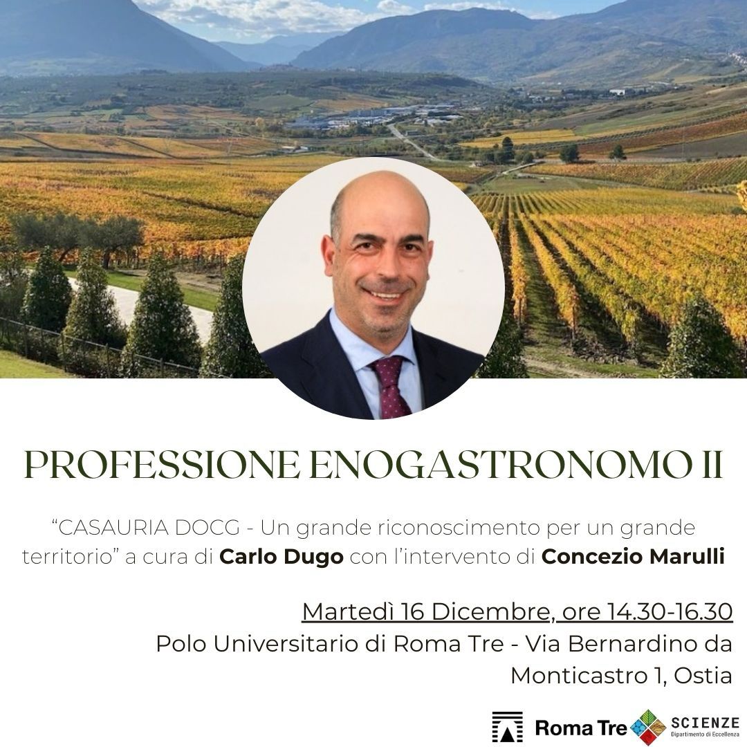 Martedì 16 dicembre 2025 alle ore 14:30 (Aula 3), nell’ambito dell’insegnamento Professione enogastronomo II, si terrà il seminario "CASAURIA DOCG - Un grande riconoscimento per un grande territorio", presso il polo universitario di Roma Tre a Ostia